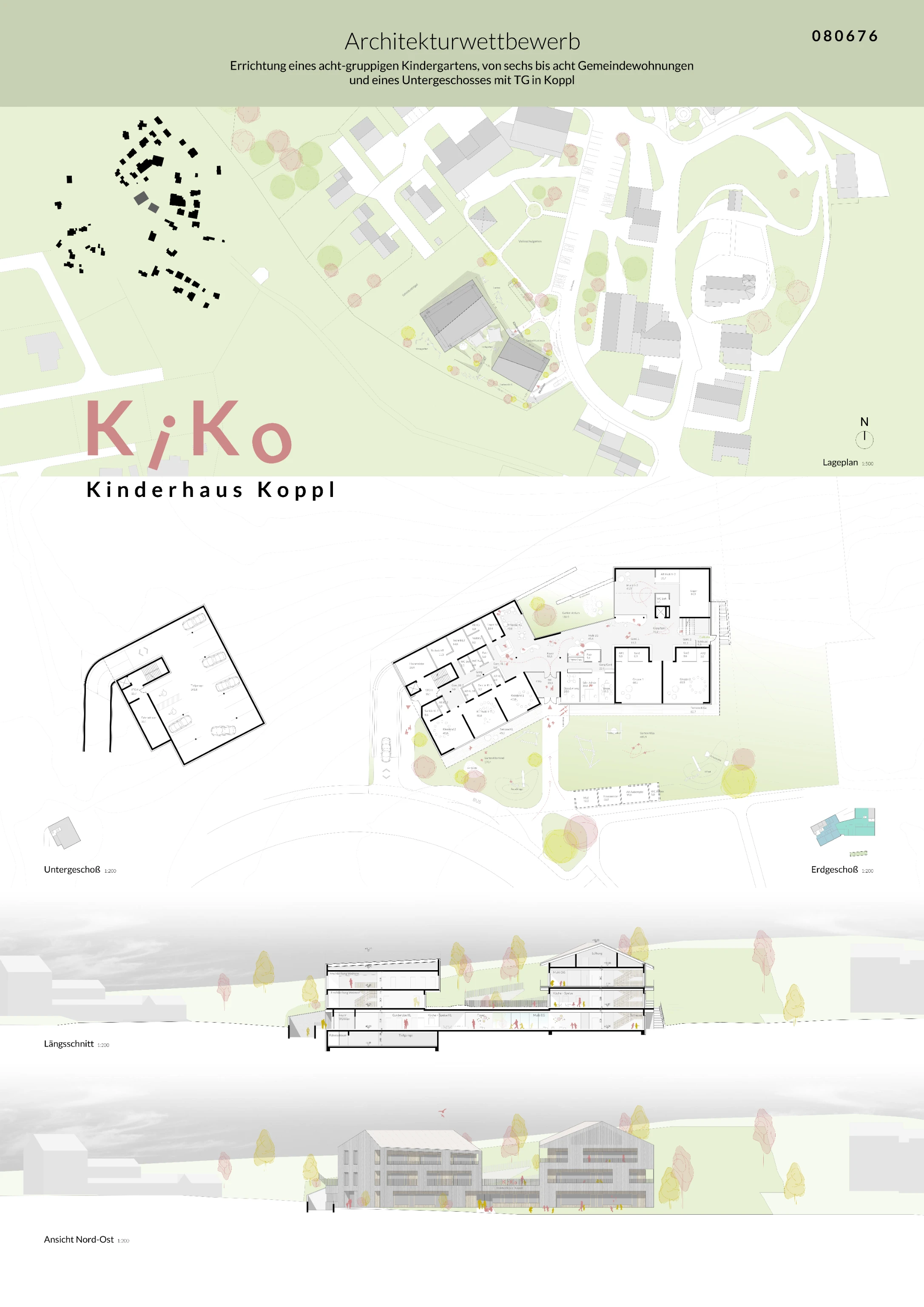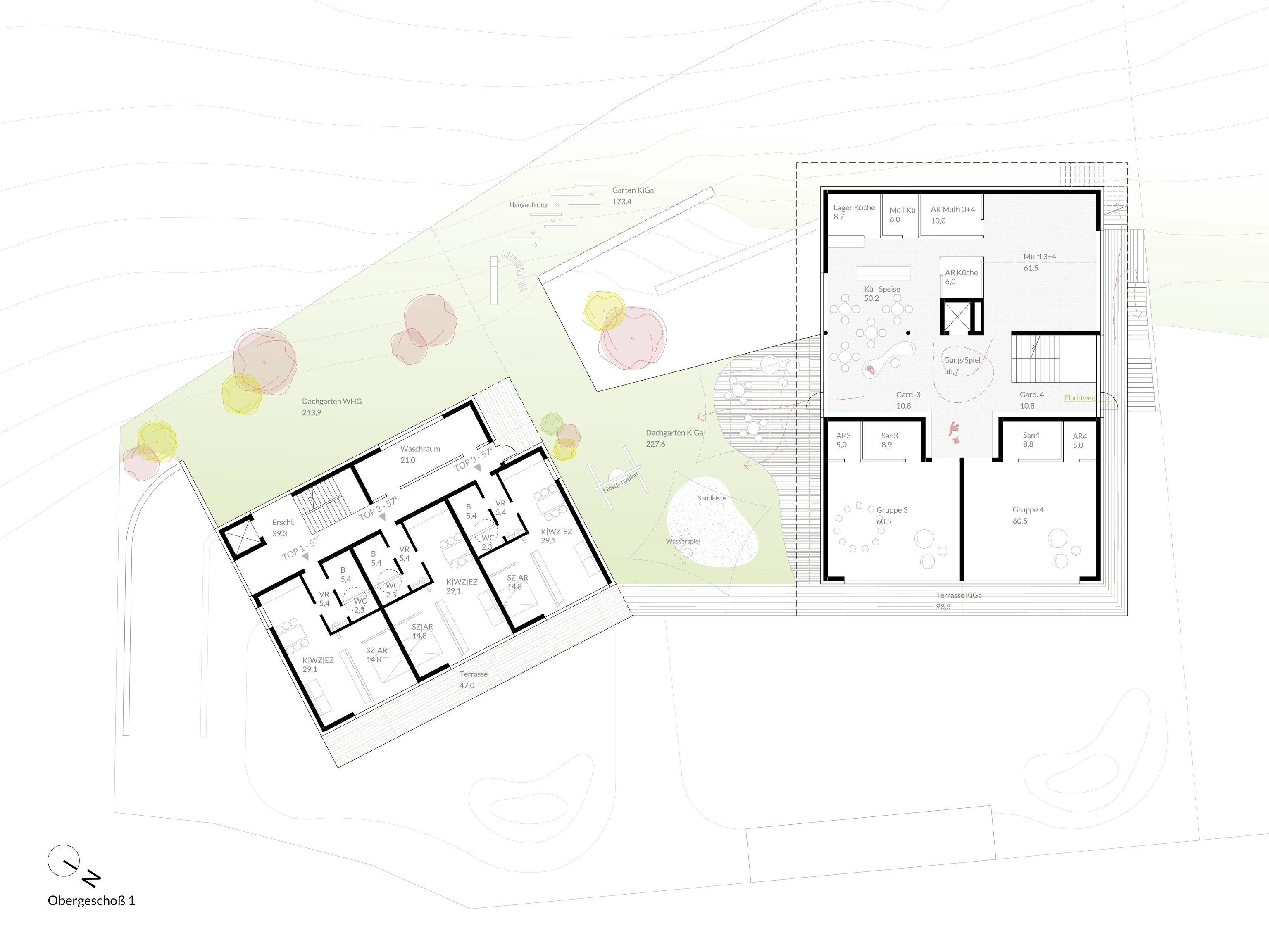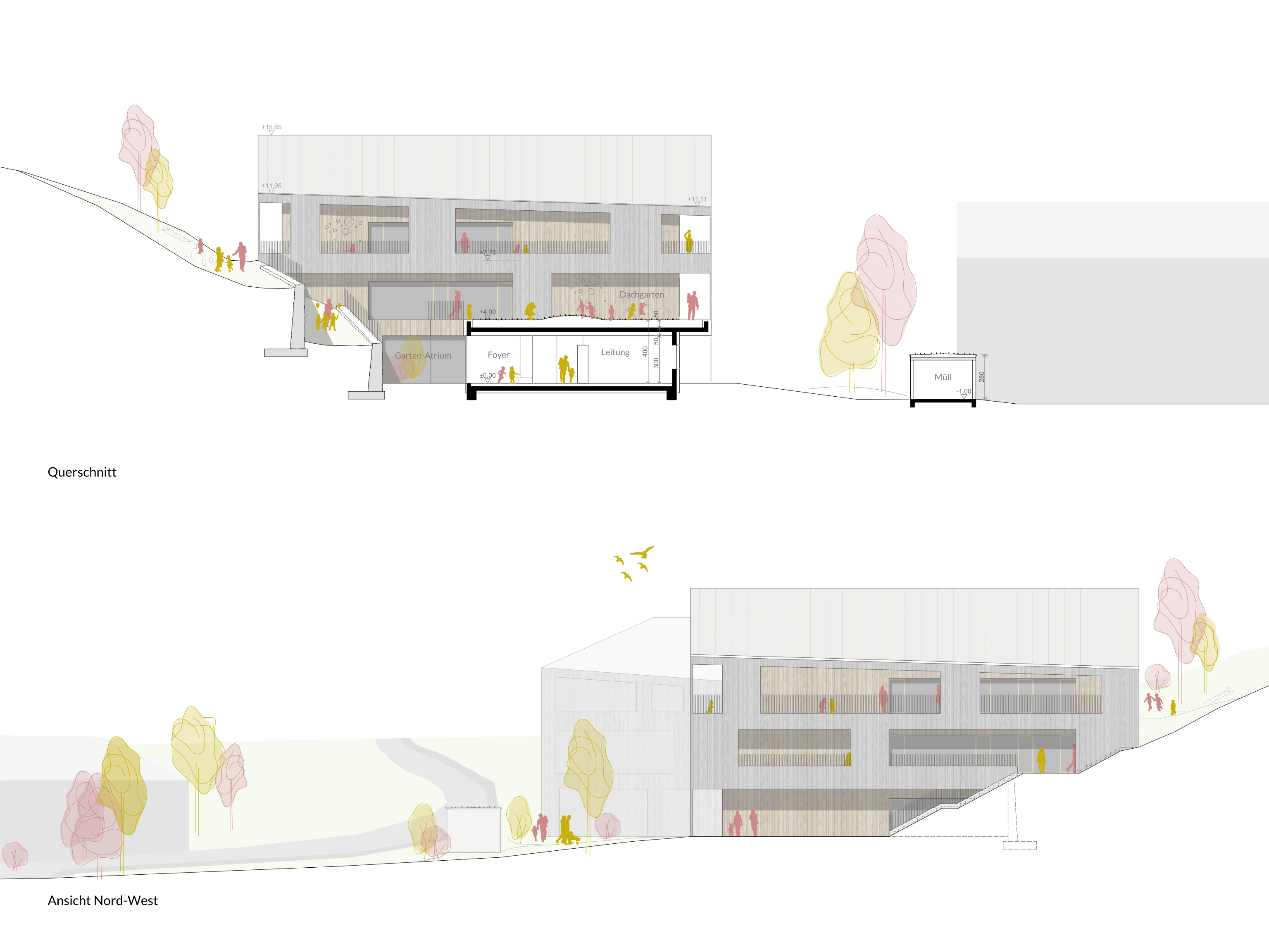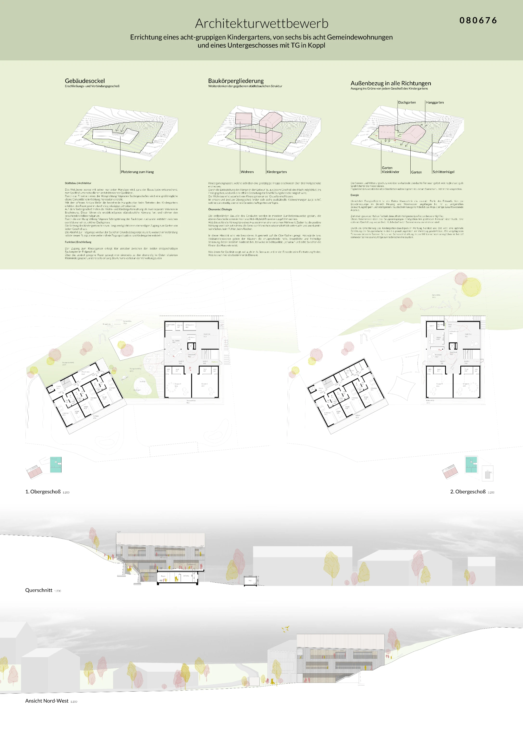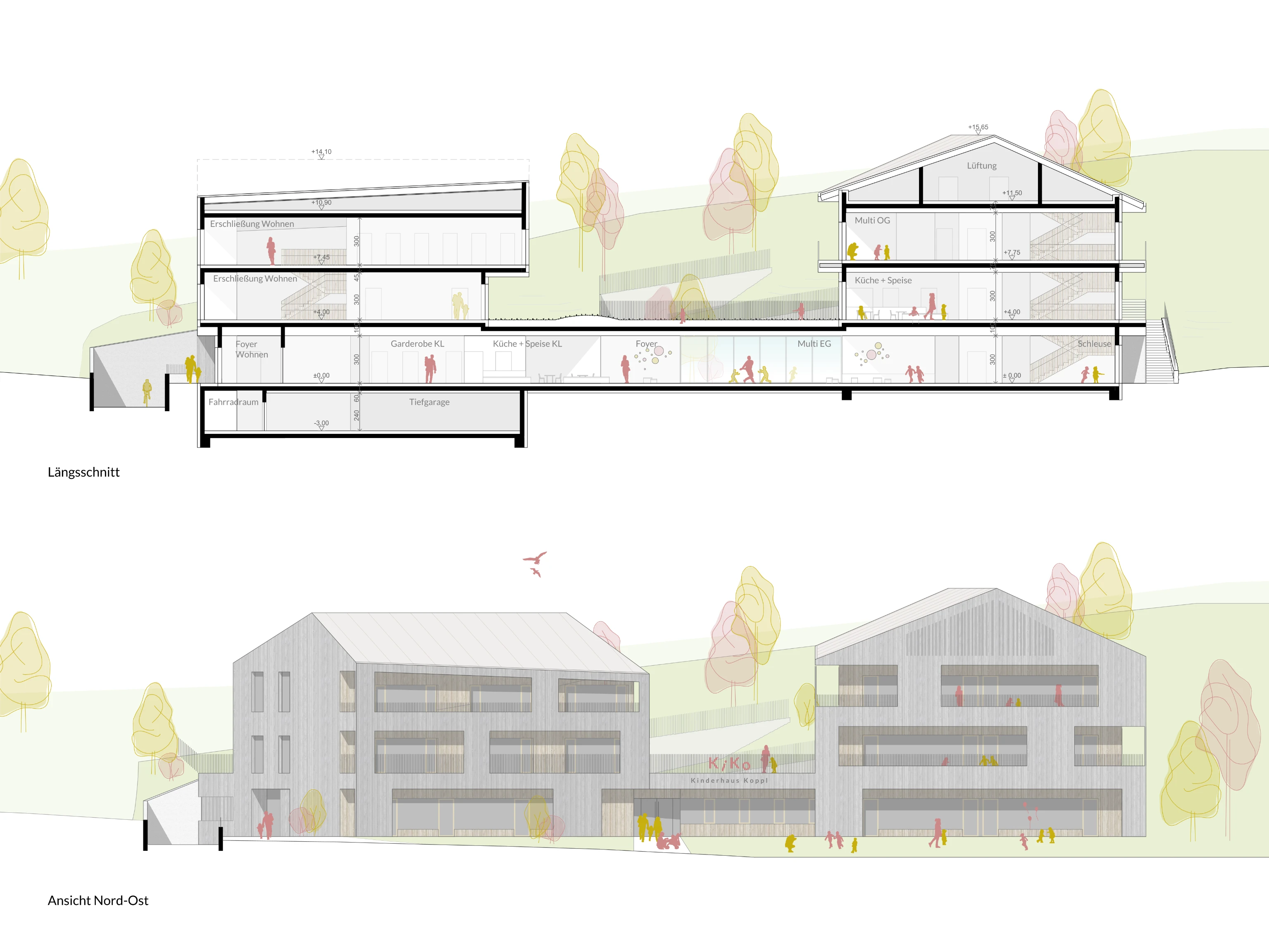 Mit dem offenen Atrium bleibt die bestehende Hangsituation beim Betreten des Kindergartens erlebbar, das Foyer gewinnt durch die großzügige Lichtsituation. Auf dem Sockelgeschoß treten die Wohn- und Kindergartennutzung als zwei separate Volumen in Erscheinung. Diese führen die ortsbildprägende städtebauliche Körnung fort und rahmen den bestehenden Volksschulgarten. Durch die der Hangrichtung folgende Schrägstellung der Baukörper zueinander entsteht zwischen den Volumen ein attraktiver Dachgarten.