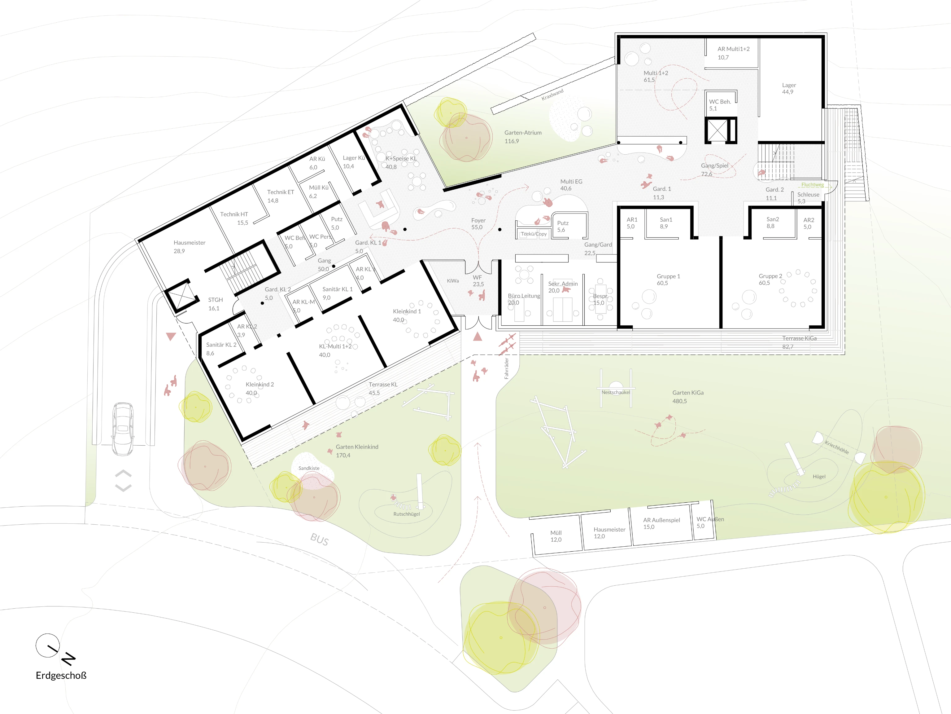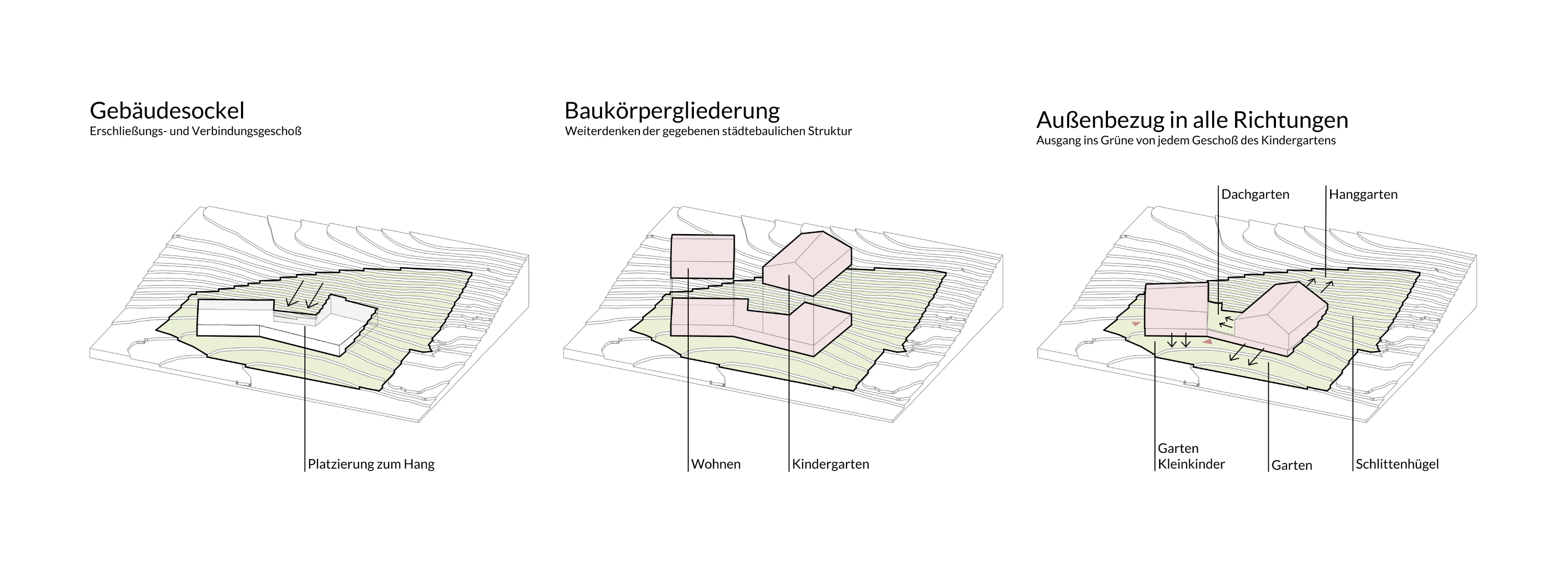 Die Setzung des Kindergartens hin zum Hang ermöglicht einen ebenerdigen Zugang zum Garten von jedem Geschoß aus. Die Abfahrt zur Tiefgarage wird an der östlichen Grundstücksgrenze situiert, wodurch in Verbindung mit der neuen Busspur eine verkehrsfreie Zugangssituation zum Kindergarten entsteht.