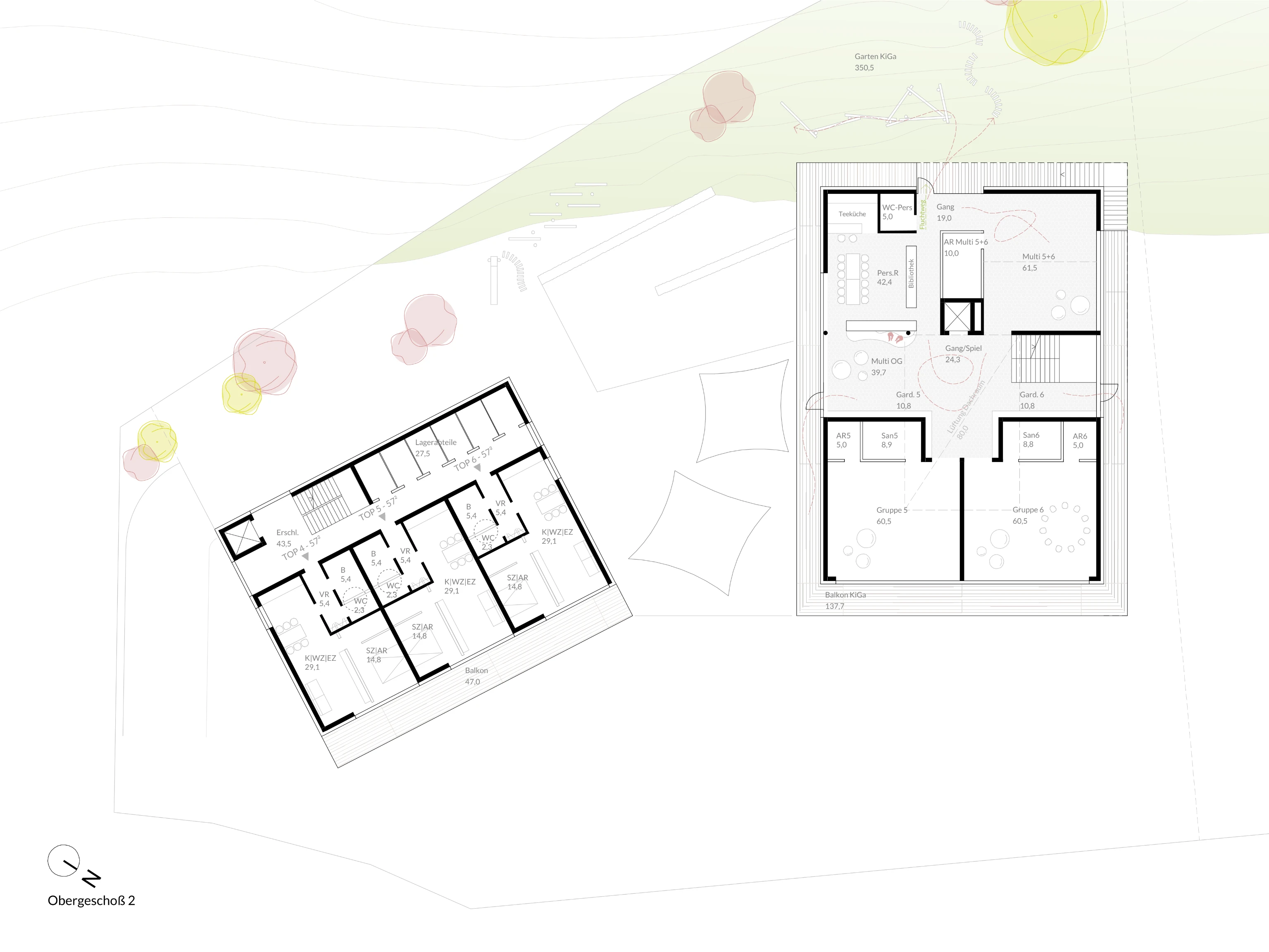 Der Wohnbau wird separiert vom Kindergarten an der Ostseite erschlossen. Im ersten und zweiten Obergeschoß finden sich sechs qualitätvolle Kleinwohnungen zu je 57m², welche südostseitig über einen Gemeinschaftsgarten verfügen.